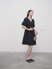 Women's Black V Neck Puff Sleeves Stable Sucker Shirring Smocking Design Dress